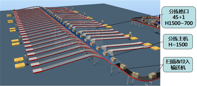 - 配置45個分揀格口及1個容錯格口,分揀格口采用動態變址技術。分揀格口采用無動力增大緩存量(10箱以上)。