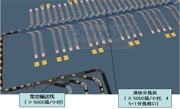 - 箱分揀系統采用高速滑塊分揀機,分揀效率(實際通過能力) ≥ 5000箱/小時,用于實現箱式貨物的訂單分揀及路徑分揀。